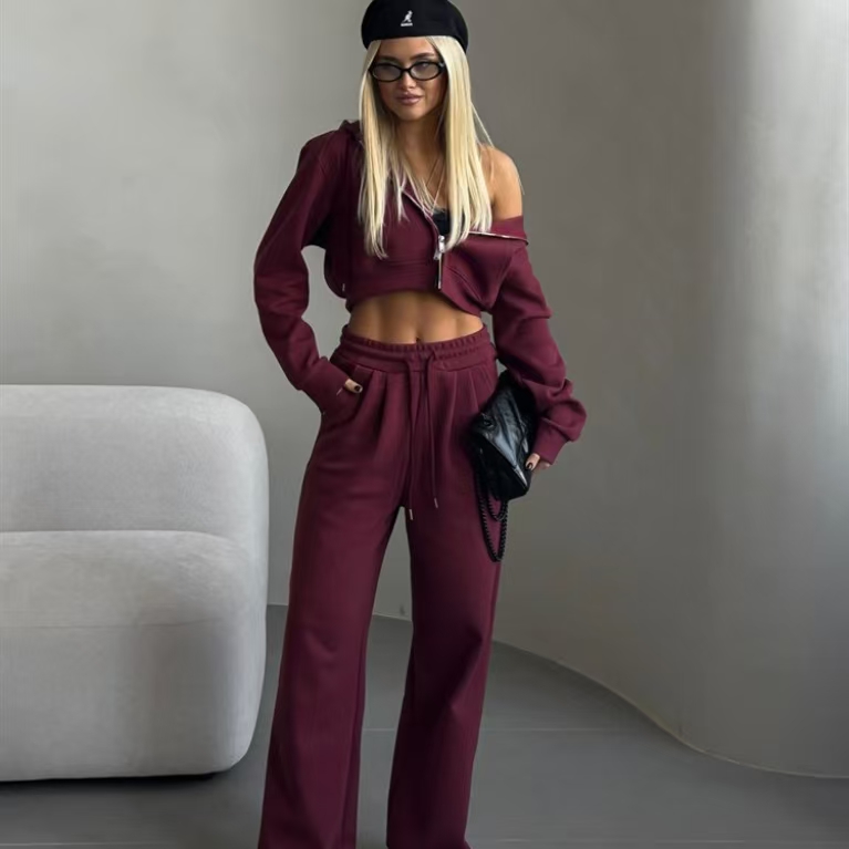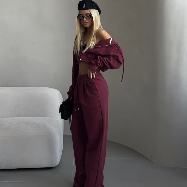 New Long-Sleeve Half-High Neck Cardigan Sweatshirt Set