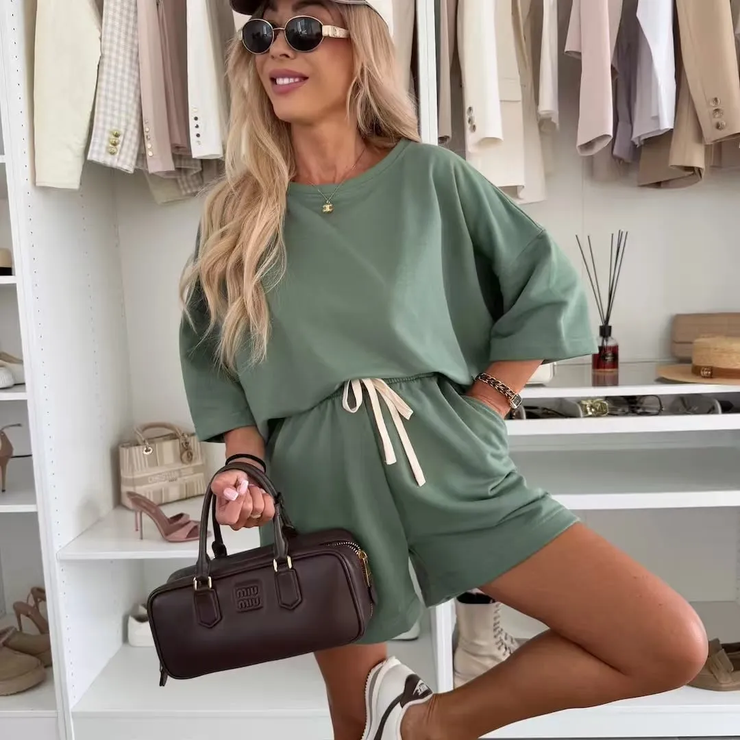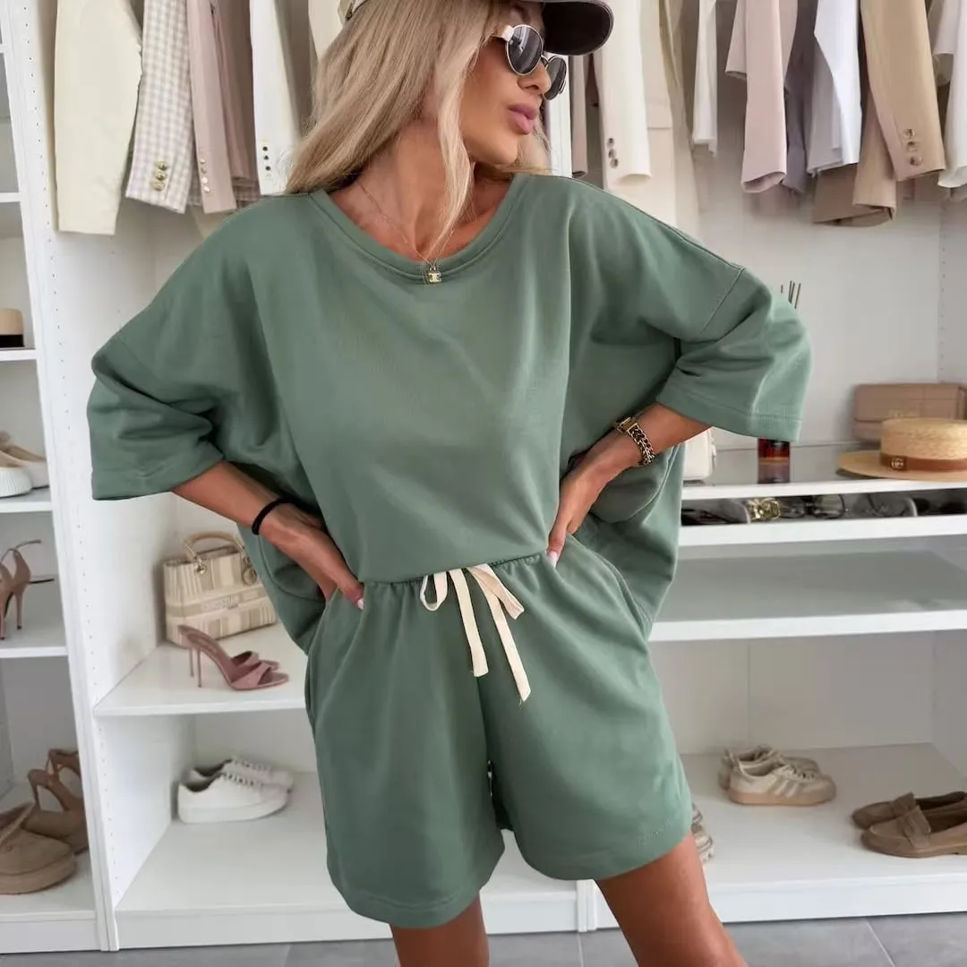 Casual Relaxed Solid-Color Crew Neck Women's Set