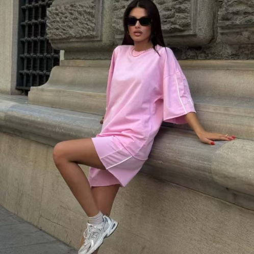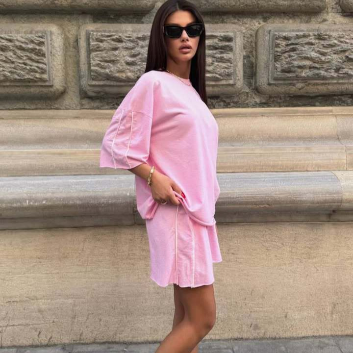 Women's Solid Color Crew Neck Short Sleeve T-Shirt Loose Fit Set